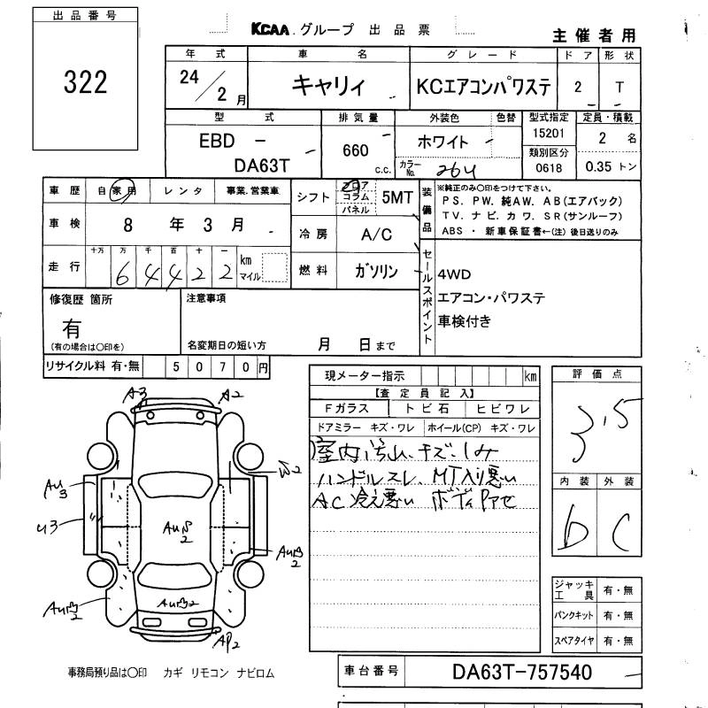 Год выпуска2012 Пробег 64 000 км КузовDA63T КомплектацияKC AIR CONDITIONER * POWER STEERING