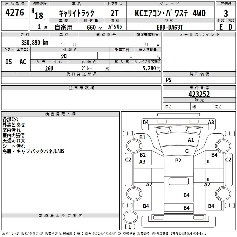351 000 км КузовDA63T КомплектацияKC AIR CONDITIONER * POWER STEERING 4WD