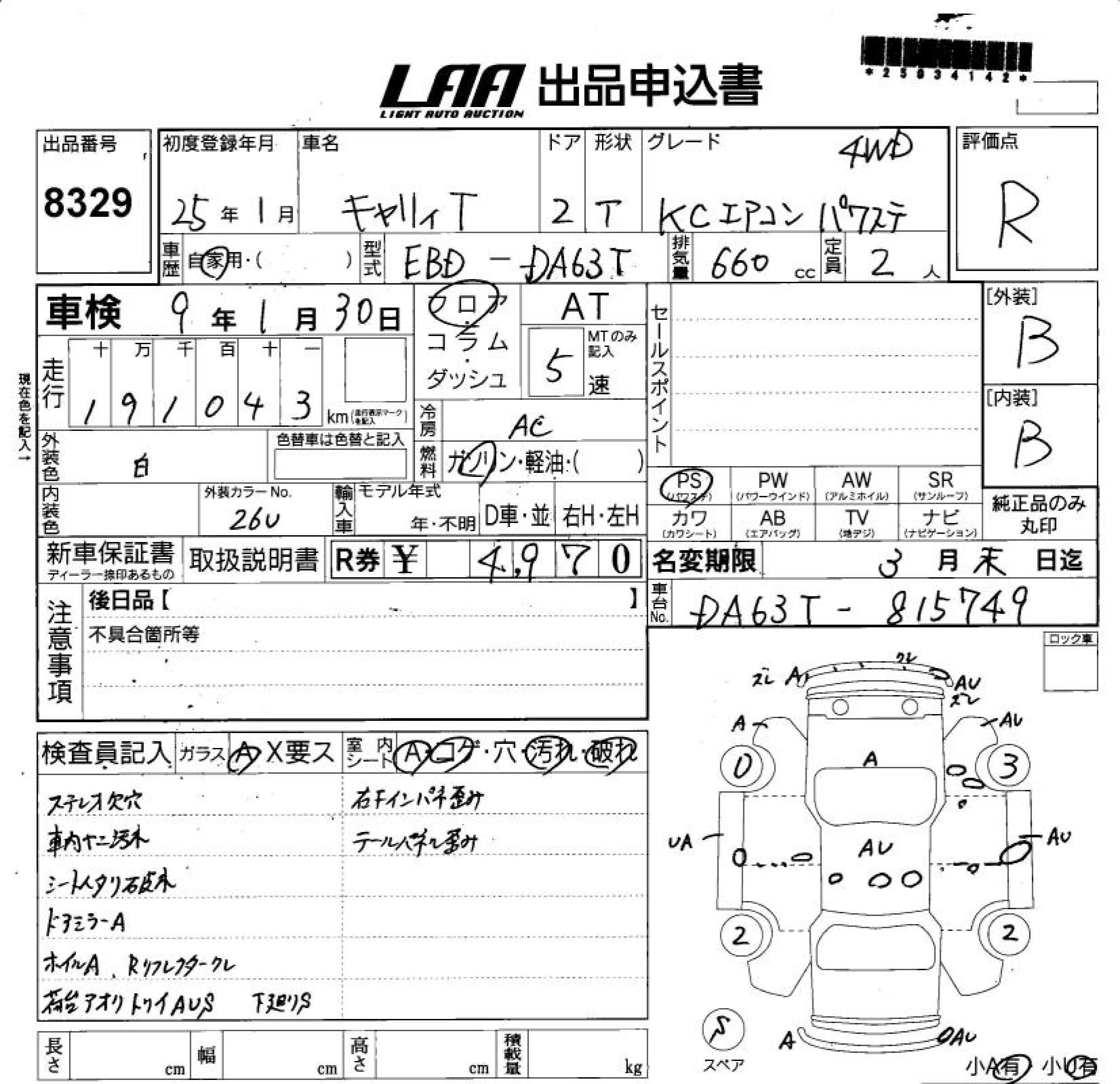 Год выпуска2013 Пробег 191 000 км КузовDA63T КомплектацияKC AIR CONDITIONER * POWER STEERING 4WD