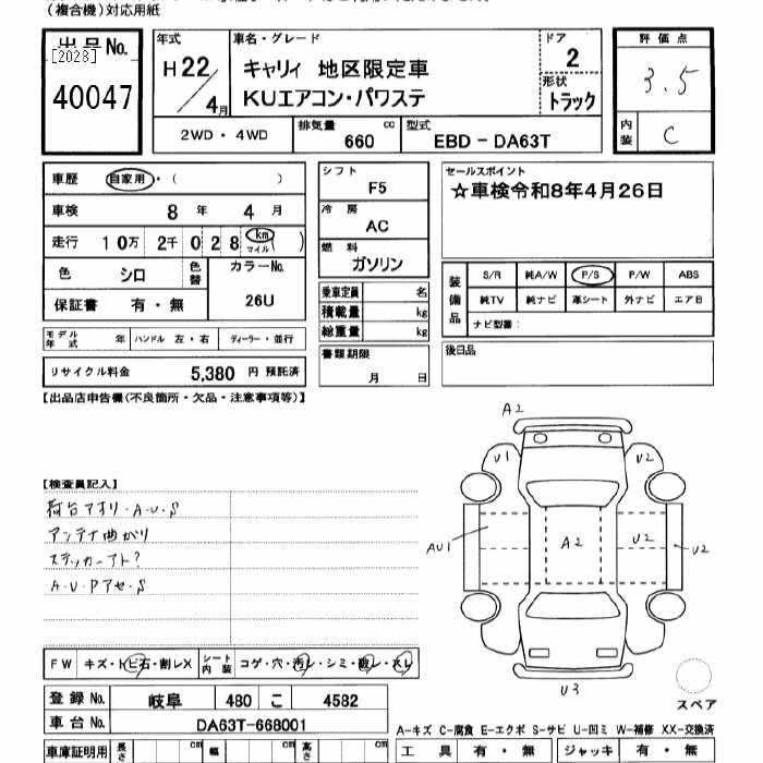 102 000 км КузовDA63T КомплектацияKU AIR CONDITIONER POWER STEERING AREA LIMITATION CAR