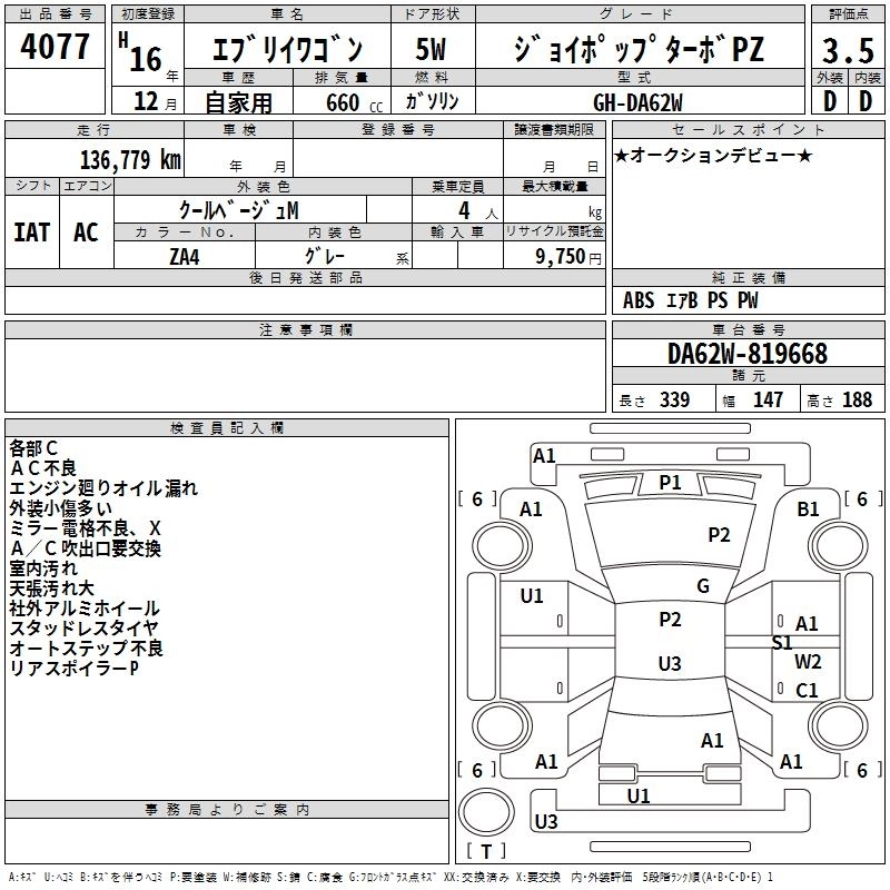 Год выпуска2004 Пробег 137 000 км КузовDA62W Комплектация JOY POP TURBO PZ