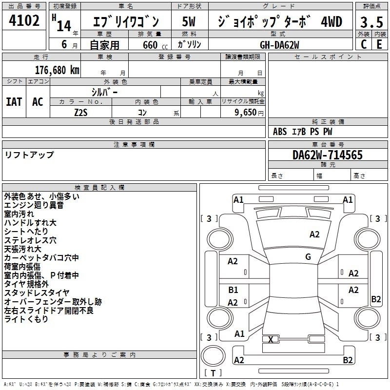 Год выпуска2002 Пробег 177 000 км КузовDA62W Комплектация JOY POP TURBO 4WD