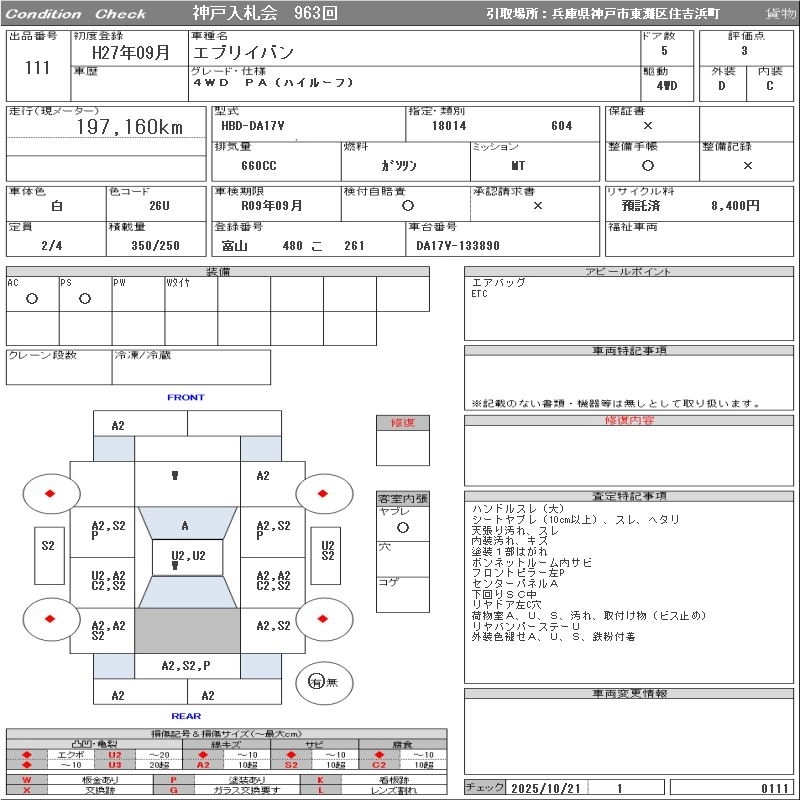 Год выпуска2015 Пробег 197 000 км КузовDA17V Комплектация4WD PA( HIGH ROOF )