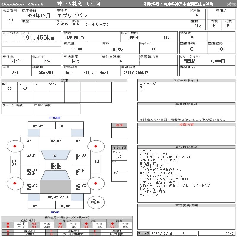 Год выпуска2017 Пробег 191 000 км КузовDA17V Комплектация4WD PA ( HIGH ROOF )