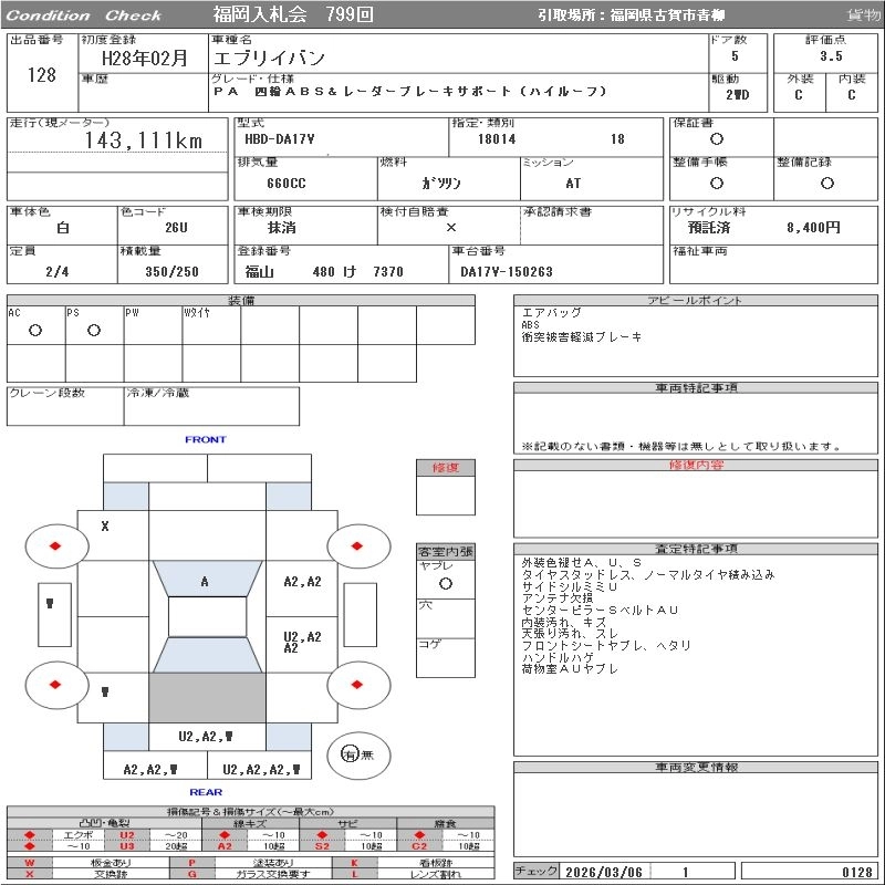 143 000 км КузовDA17V КомплектацияPA FOUR WHEEL ABS& RADAR BRAKE SUPPORT ( HIGH ROOF )