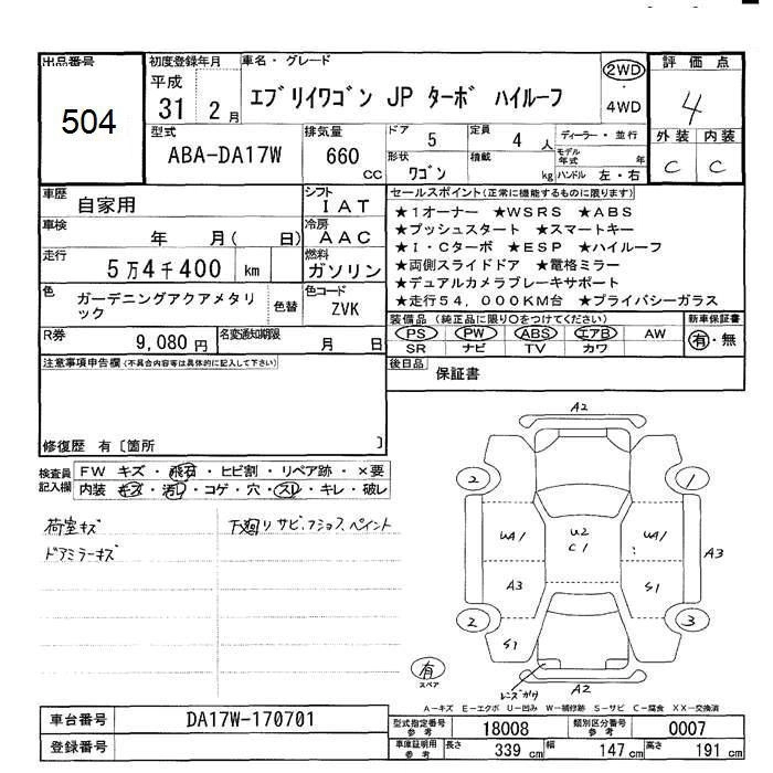 Год выпуска2019 Пробег 54 000 км КузовDA17W Комплектация4WD JP TURBO HIGH ROOF