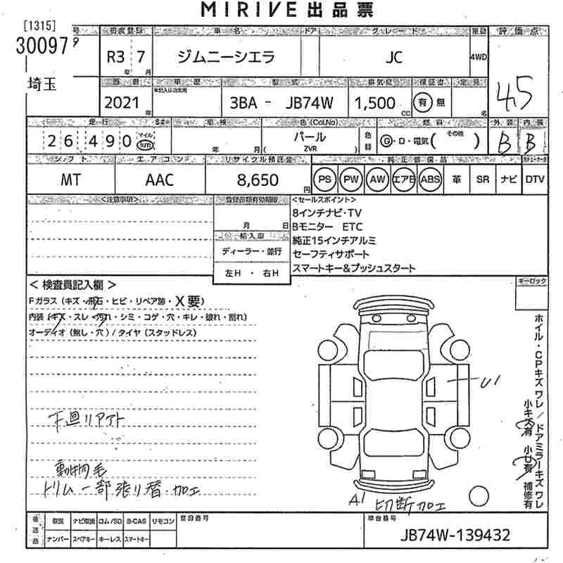 Статус выставлен на аукцион Лот 30097 Аукцион MIRIVE Saitama Дата аукциона 28.01.2026