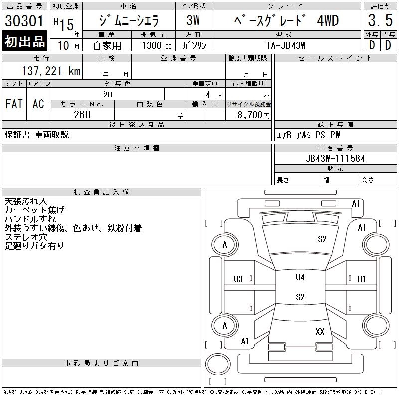 Год выпуска2003 Пробег 137 000 км КузовJB43W Комплектация BASE GRADE 4WD