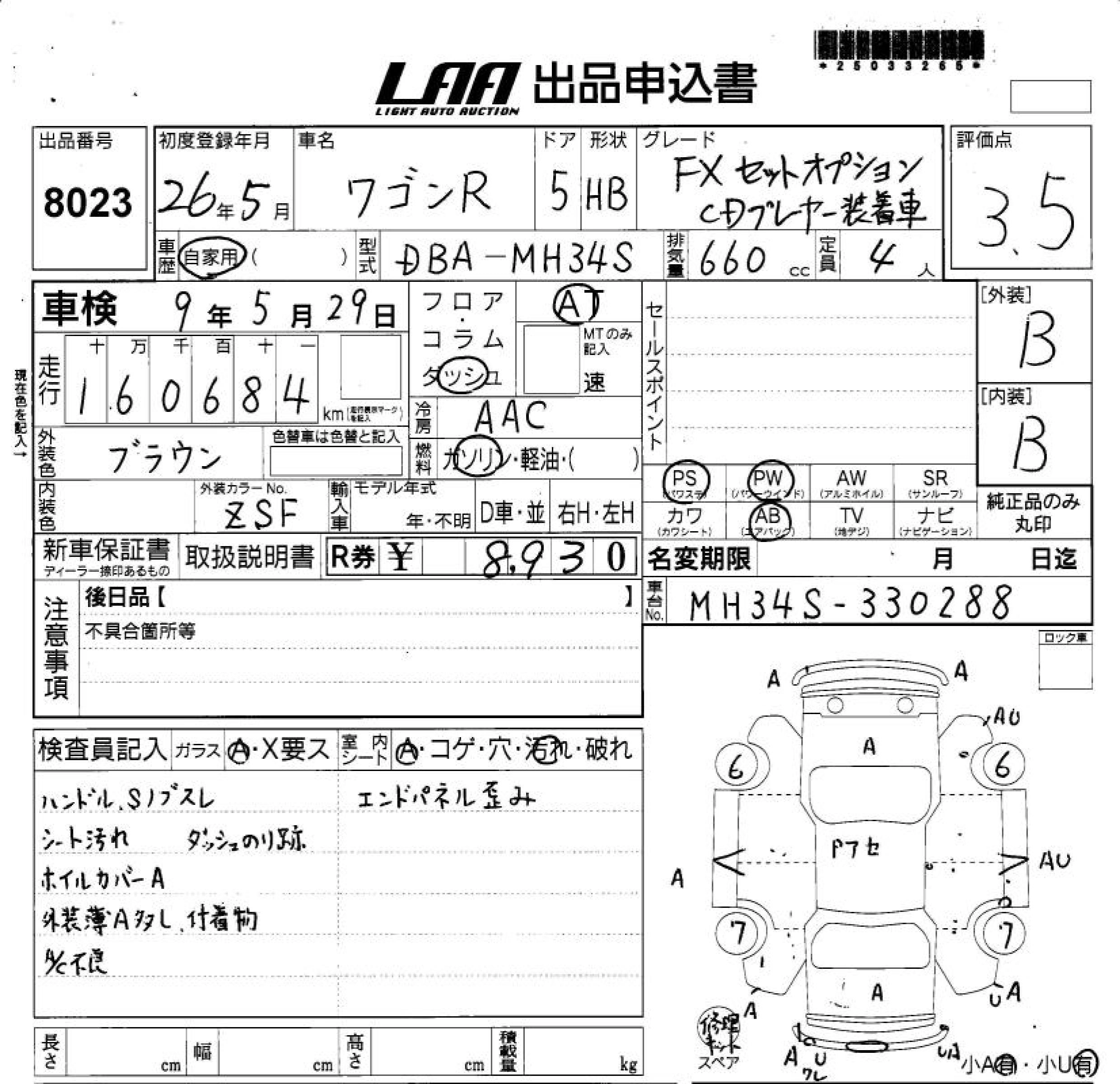 Год выпуска2014 Пробег 161 000 км КузовMH34S КомплектацияFX SET OPTION CD PRE