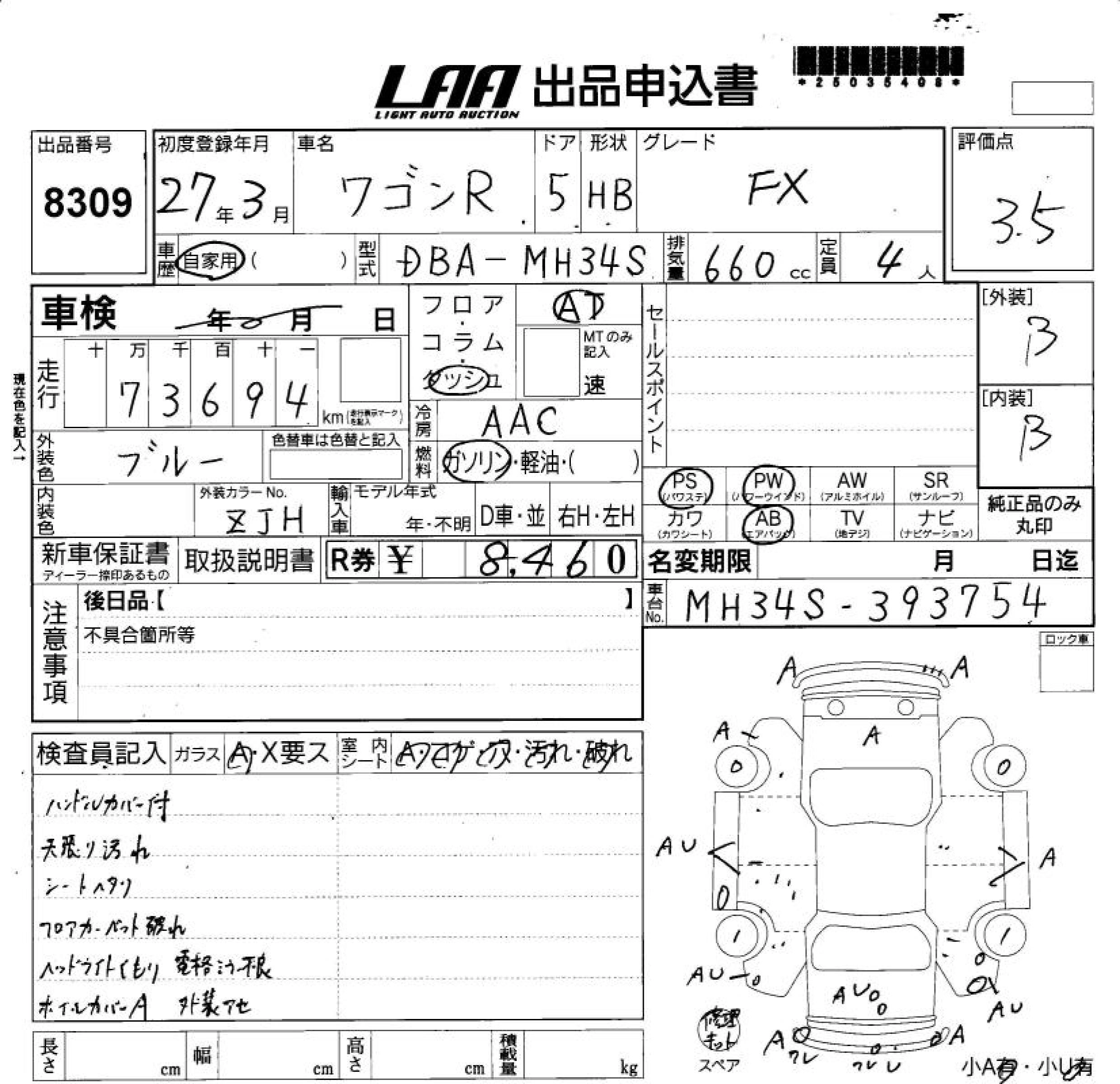 SUZUKI WAGON R 2015 г., лот № 8309