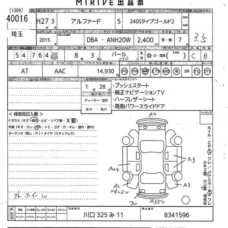 TOYOTA ALPHARD 2015 г., лот № 40016