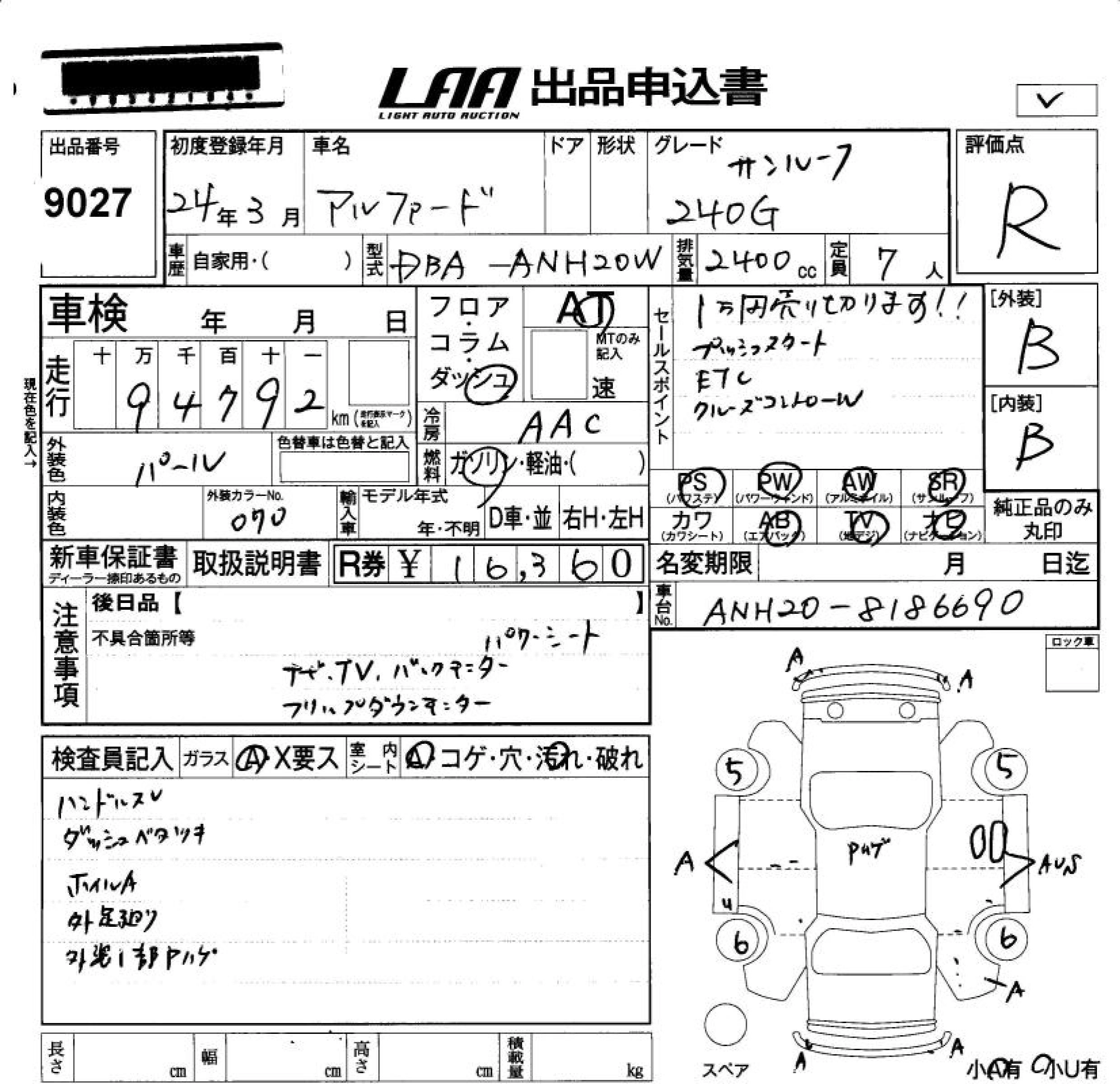 TOYOTA ALPHARD 2012 г., лот № 9027