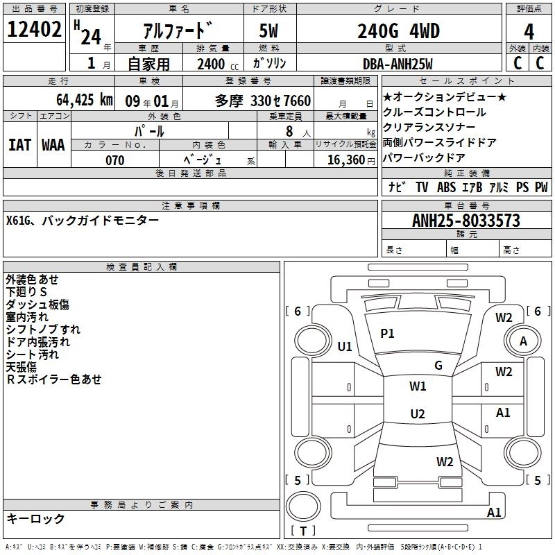 Год выпуска2012 Пробег 64 000 км КузовANH25W Комплектация240G 4WD