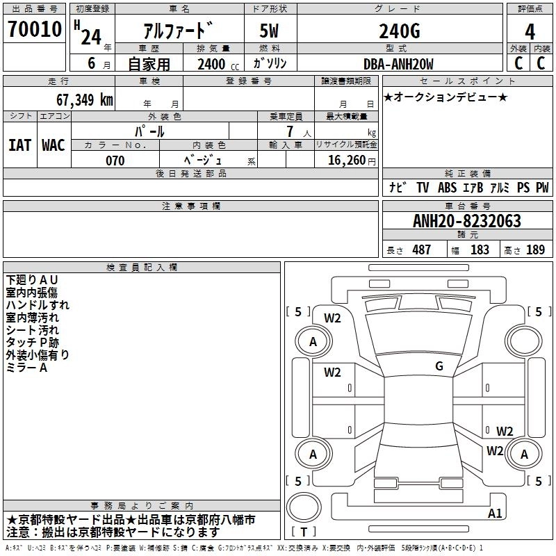TOYOTA ALPHARD 2012 г., лот № 70010