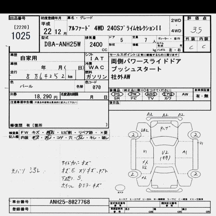 Год выпуска2010 Пробег 86 000 км КузовANH25W Комплектация4WD 240S PRIME SELECTION II
