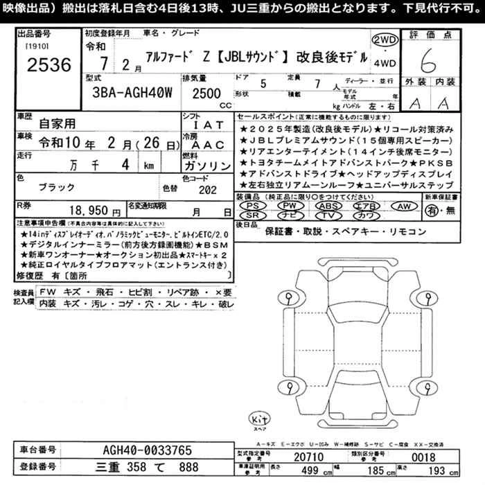 Год выпуска2025 КузовAGH40W КомплектацияZ JBL SOUND KAI RYOU GOMODEL