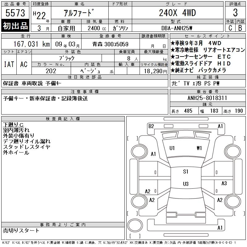 Год выпуска2010 Пробег 167 000 км КузовANH25W Комплектация240X 4WD