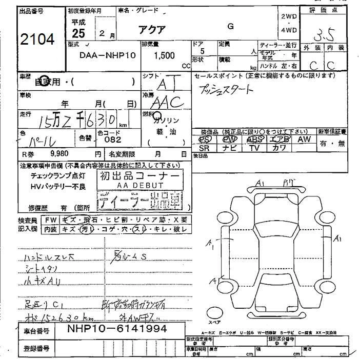 TOYOTA AQUA 2013 г., лот № 2104