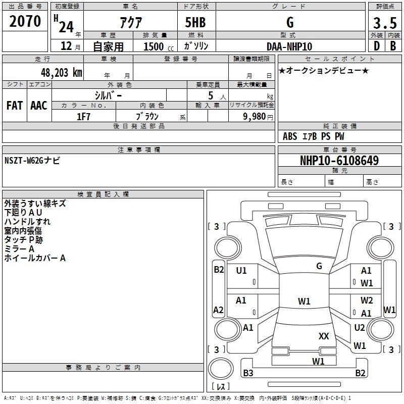 TOYOTA AQUA 2012 г., лот № 2070