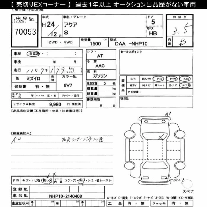 TOYOTA AQUA 2012 г., лот № 70053