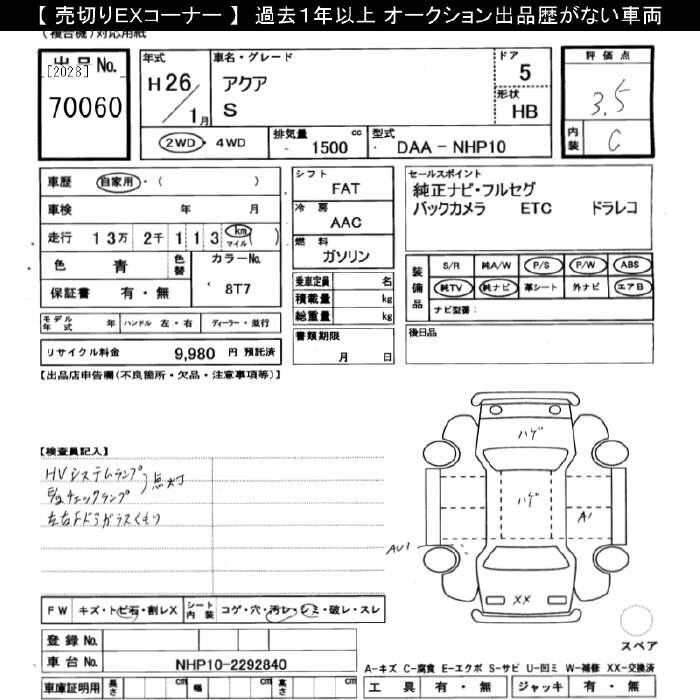 TOYOTA AQUA 2014 г., лот № 70060