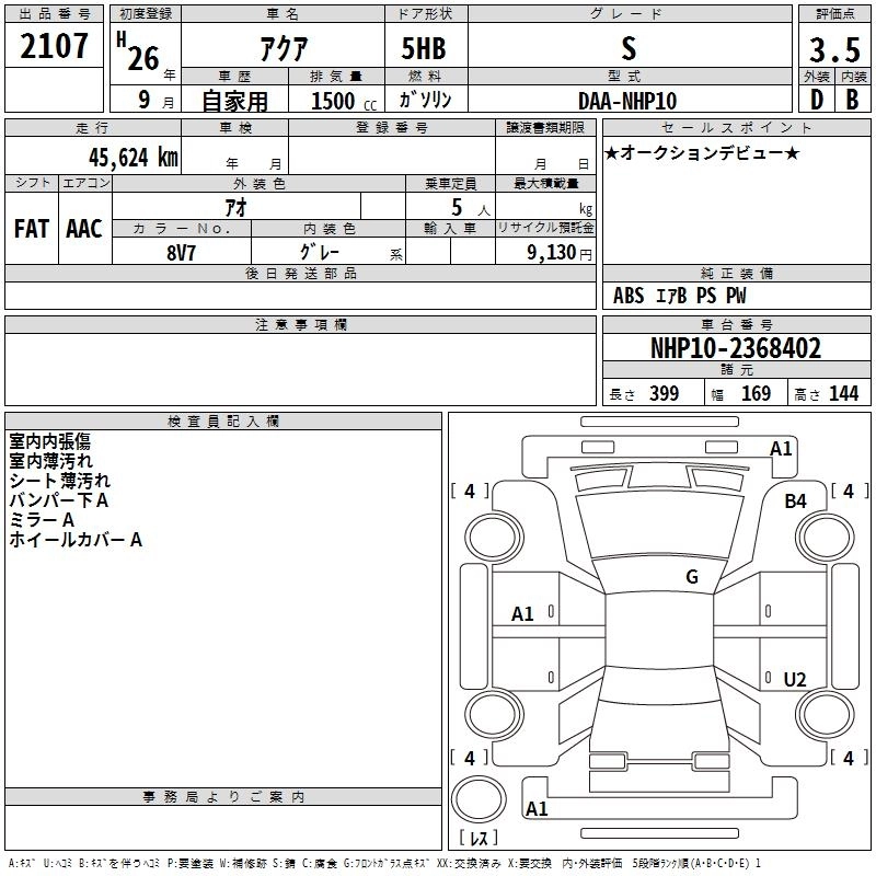 TOYOTA AQUA 2014 г., лот № 2107