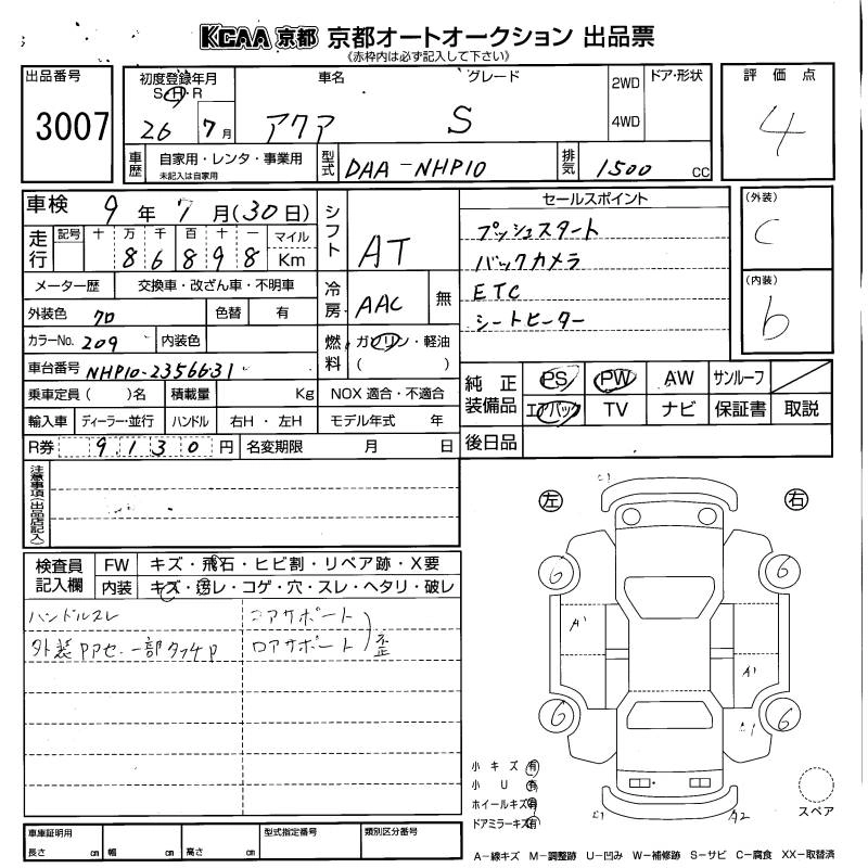 TOYOTA AQUA 2014 г., лот № 3007