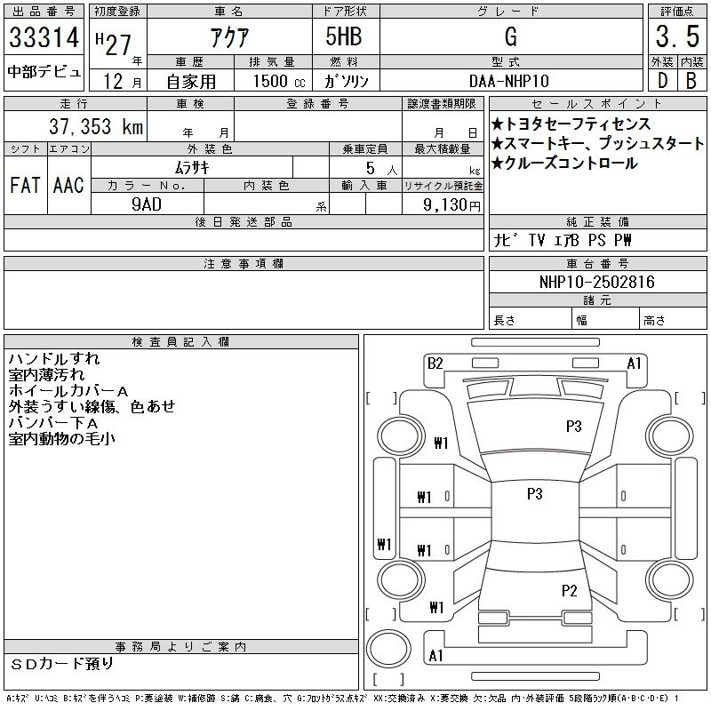 TOYOTA AQUA 2015 г., лот № 33314