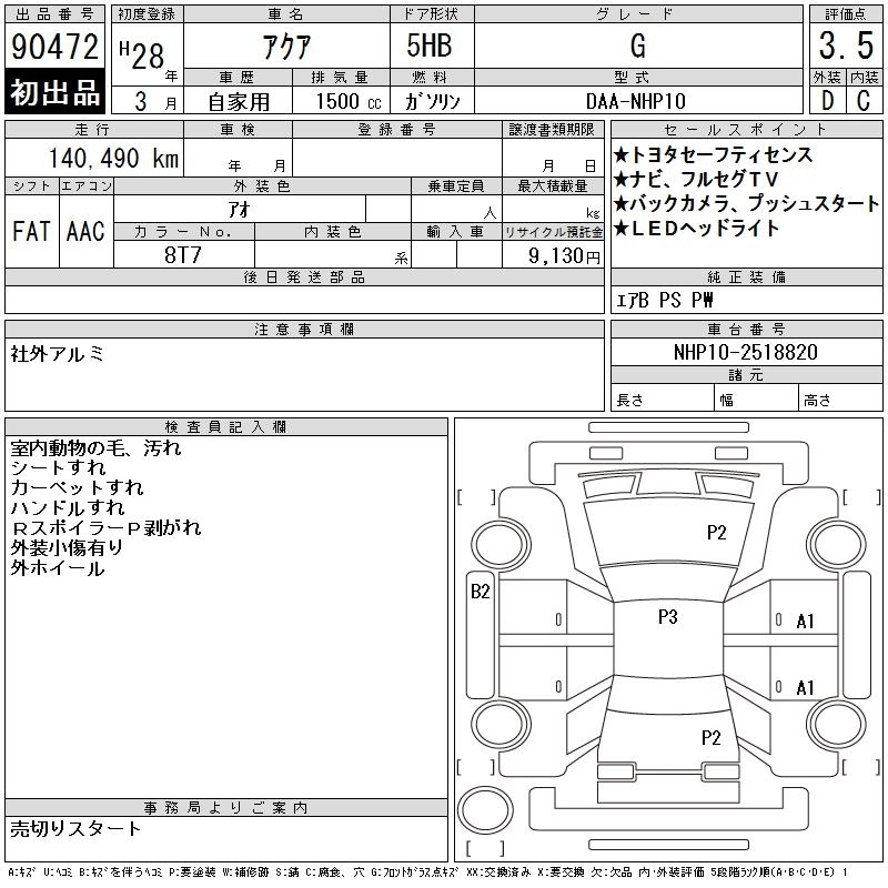 TOYOTA AQUA 2016 г., лот № 90472
