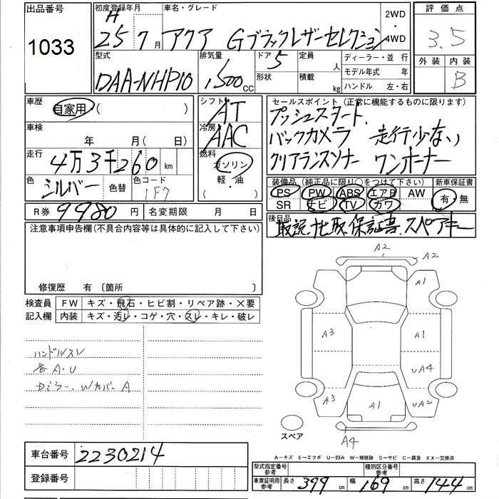 TOYOTA AQUA 2013 г., лот № 1033
