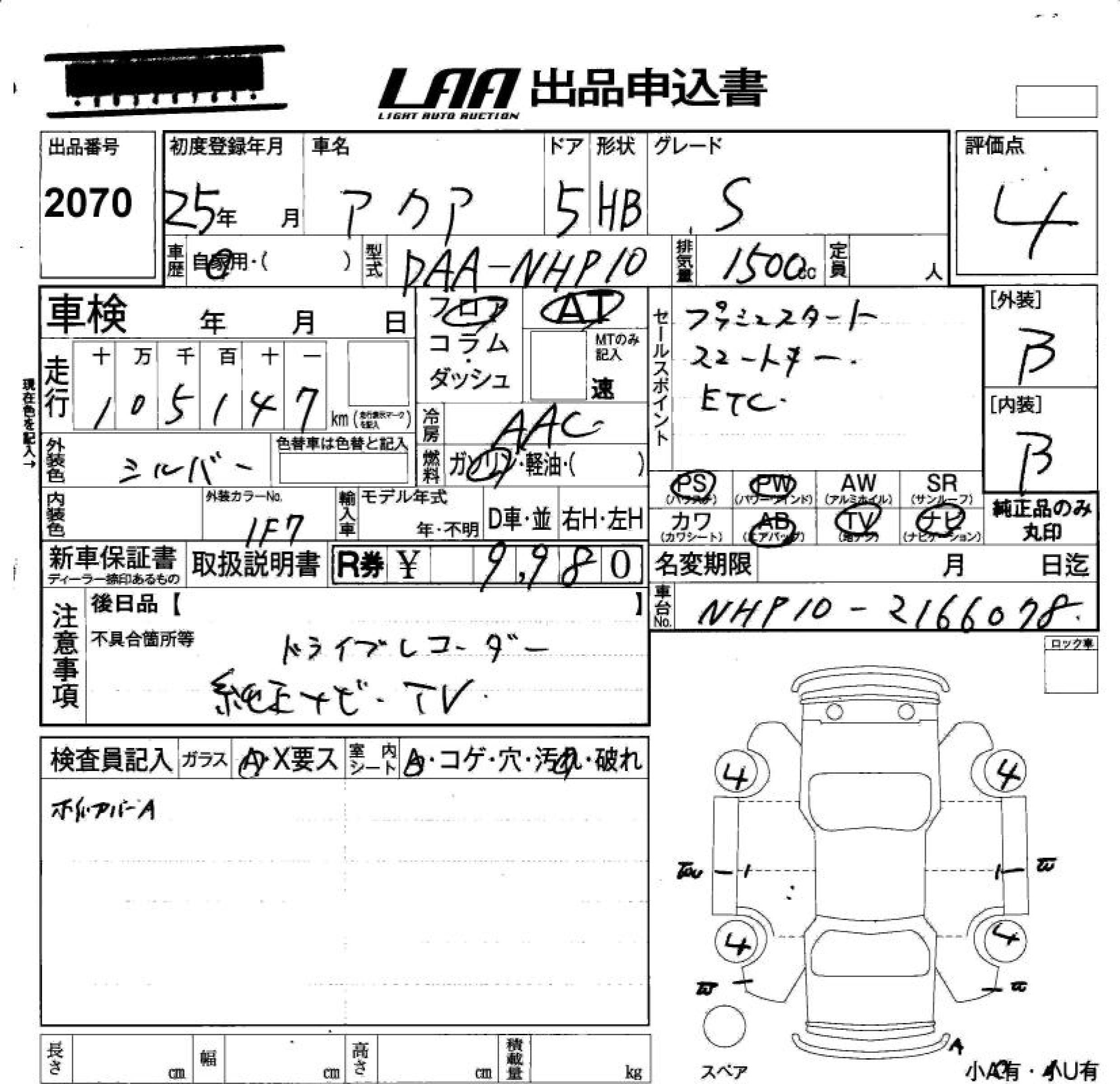 TOYOTA AQUA 2013 г., лот № 2070