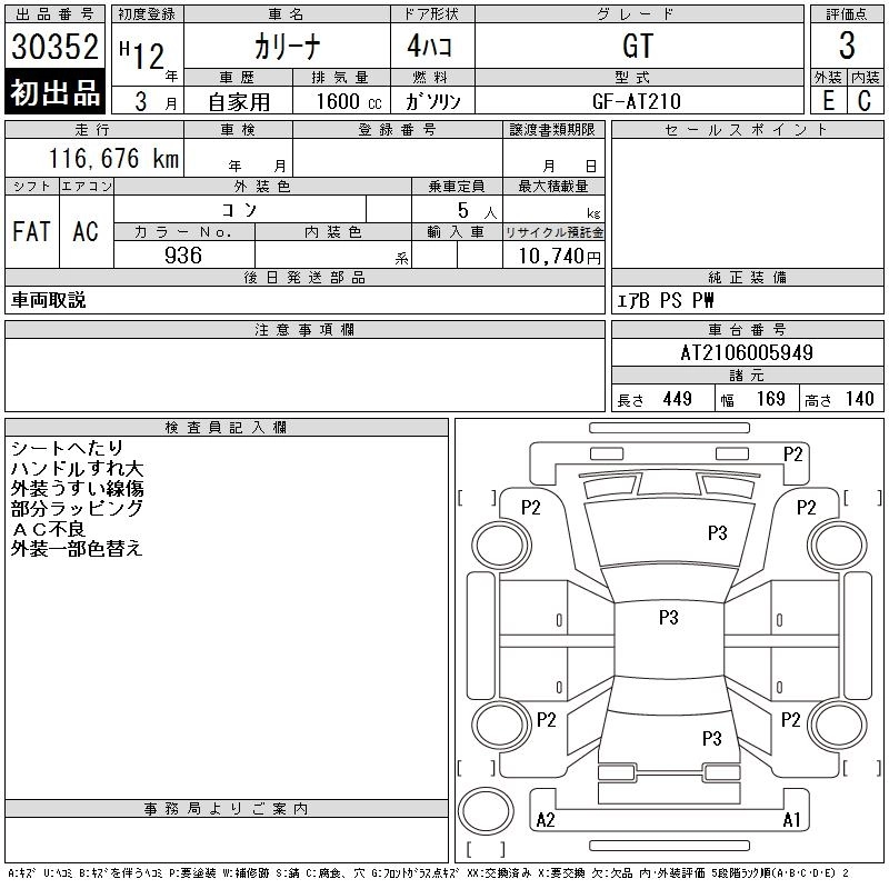 TOYOTA CARINA 2000 г., лот № 30352
