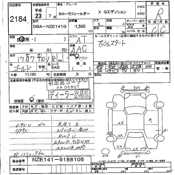TOYOTA COROLLA FIELDER 2011 г., лот № 2184