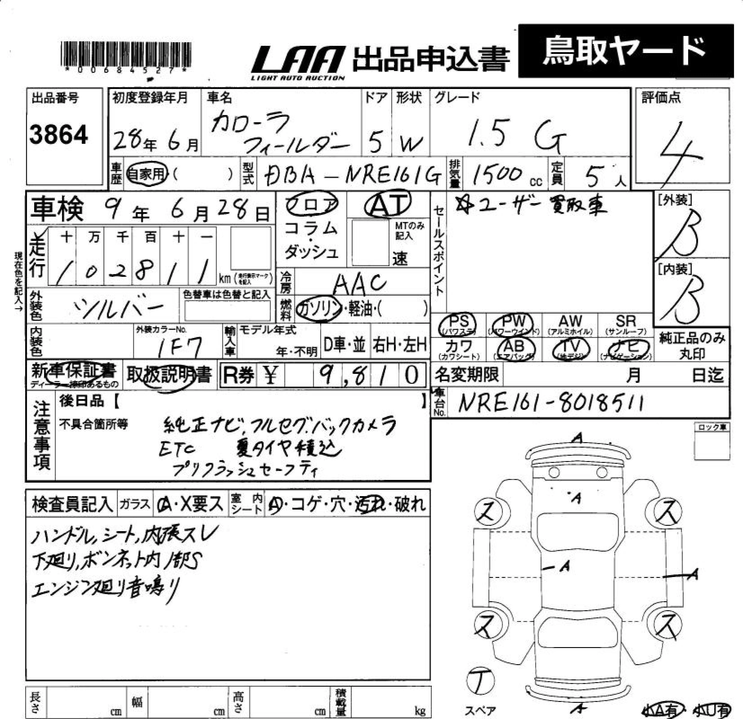 TOYOTA COROLLA FIELDER 2016 г., лот № 3864