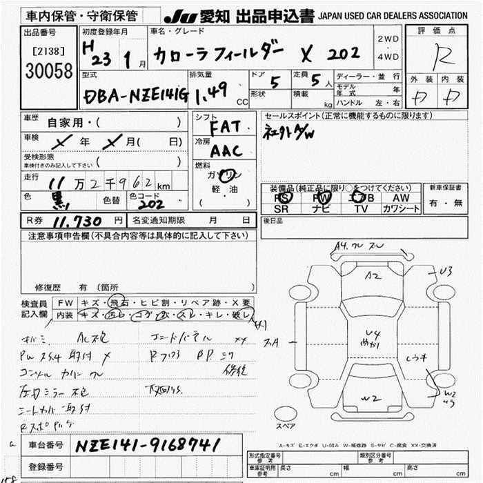 TOYOTA COROLLA FIELDER 2011 г., лот № 30058