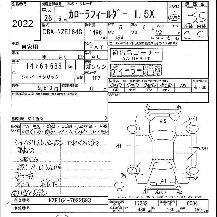 TOYOTA COROLLA FIELDER 2014 г., лот № 2022