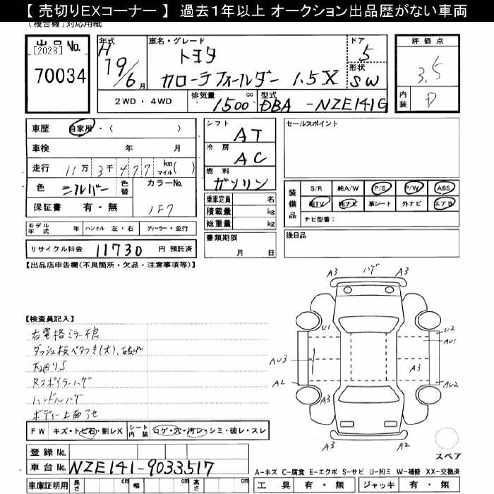 TOYOTA COROLLA FIELDER 2007 г., лот № 70034