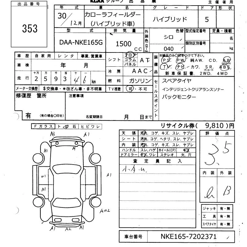 TOYOTA COROLLA FIELDER 2018 г., лот № 353