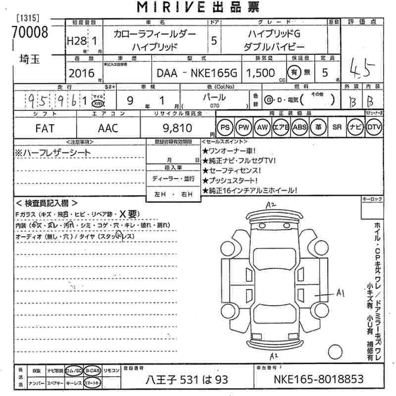 TOYOTA COROLLA FIELDER 2016 г., лот № 70008