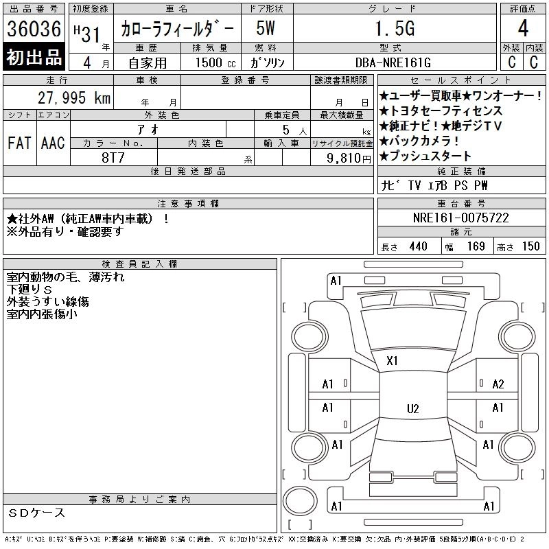 TOYOTA COROLLA FIELDER 2019 г., лот № 36036