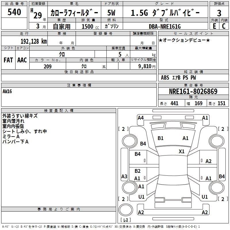 TOYOTA COROLLA FIELDER 2017 г., лот № 540