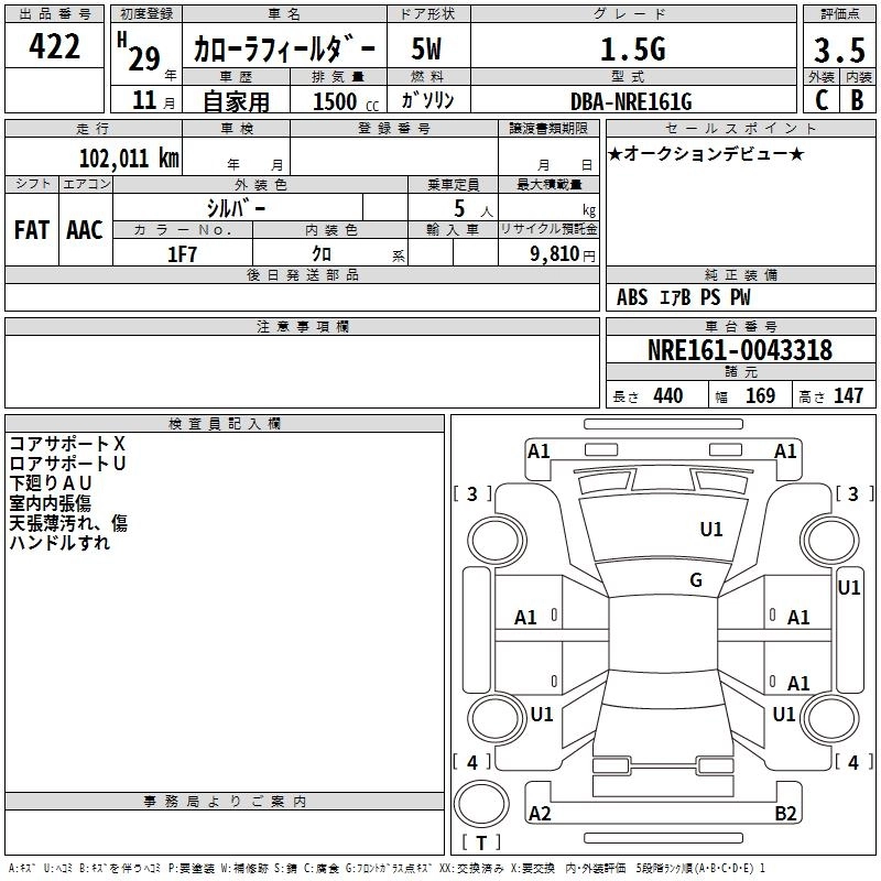 TOYOTA COROLLA FIELDER 2017 г., лот № 422