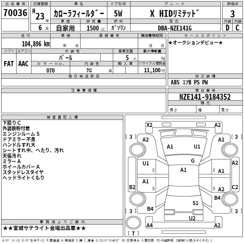 TOYOTA COROLLA FIELDER 2011 г., лот № 70036