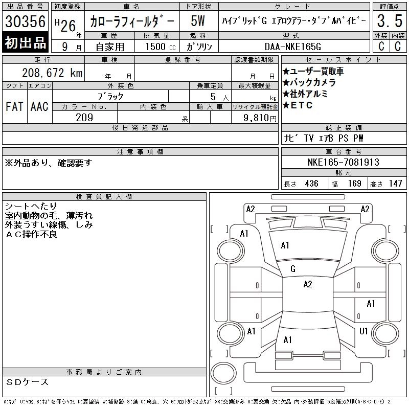 TOYOTA COROLLA FIELDER 2014 г., лот № 30356
