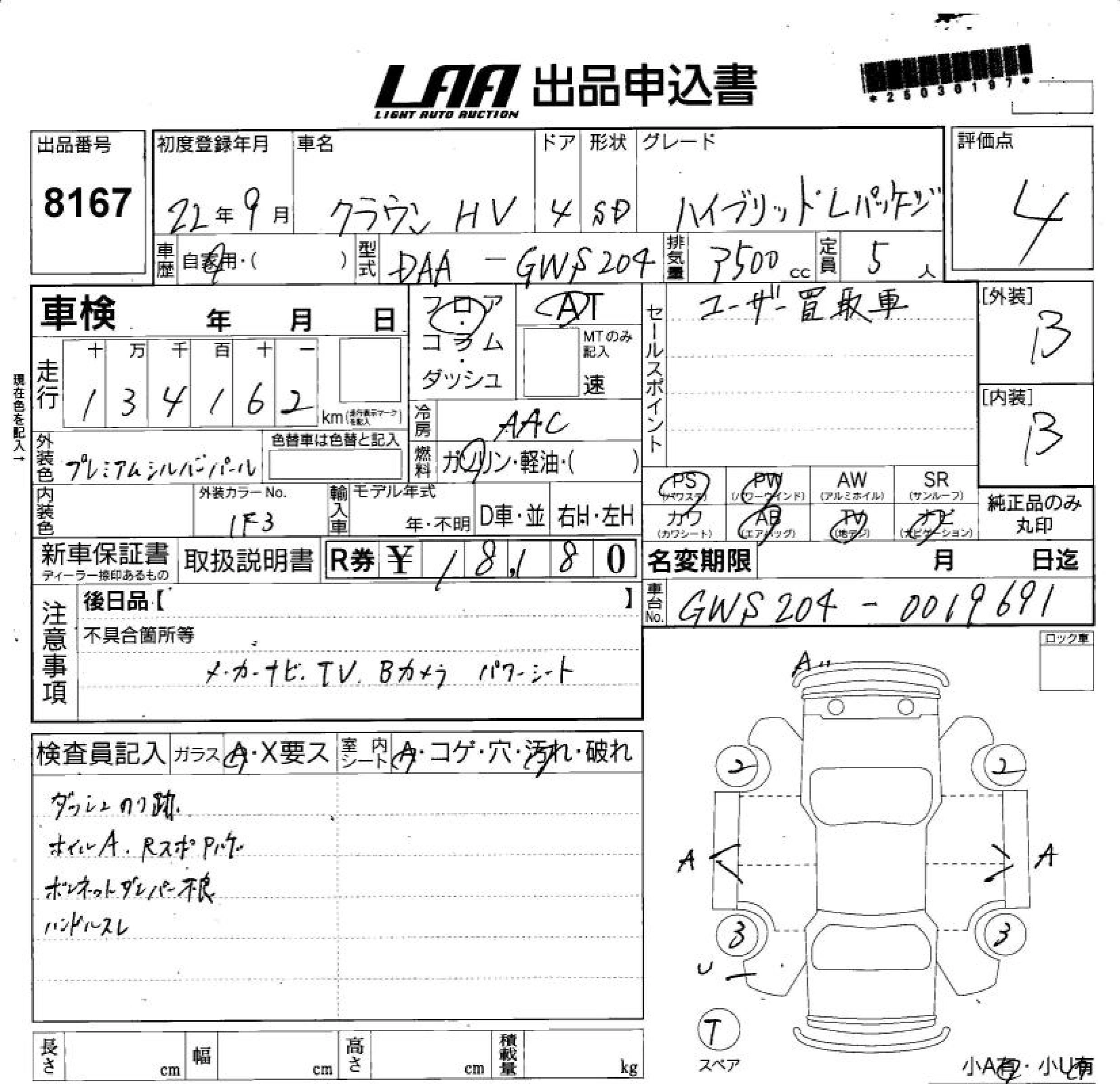 TOYOTA CROWN HYBRID 2010 г., лот № 8167