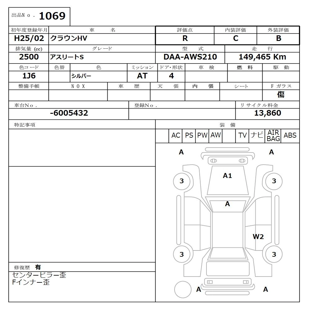 TOYOTA CROWN HYBRID 2013 г., лот № 1069