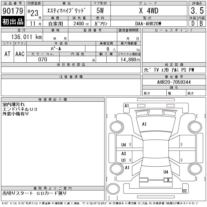 TOYOTA ESTIMA HYBRID 2011 г., лот № 90179