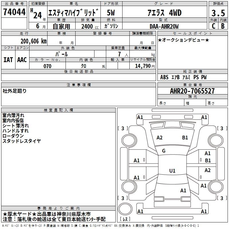 TOYOTA ESTIMA HYBRID 2012 г., лот № 74044