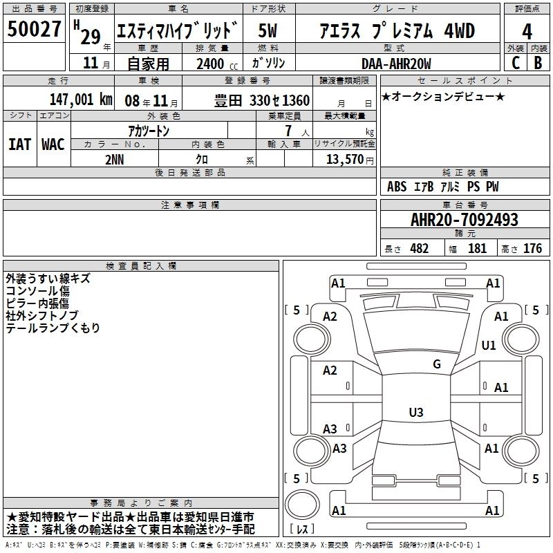 TOYOTA ESTIMA HYBRID 2017 г., лот № 50027