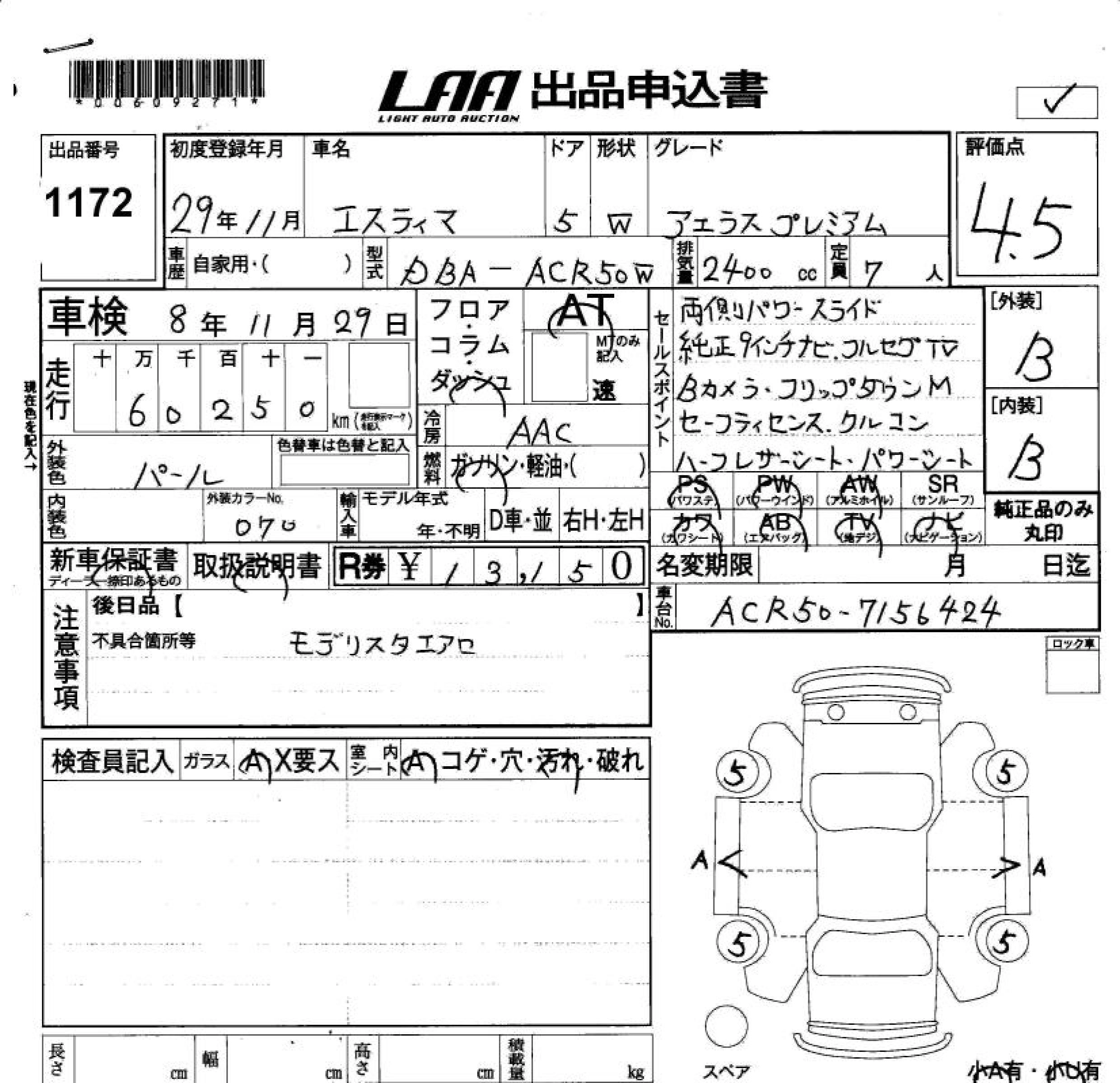 TOYOTA ESTIMA 2017 г., лот № 1172